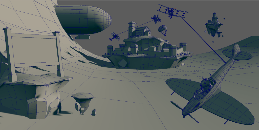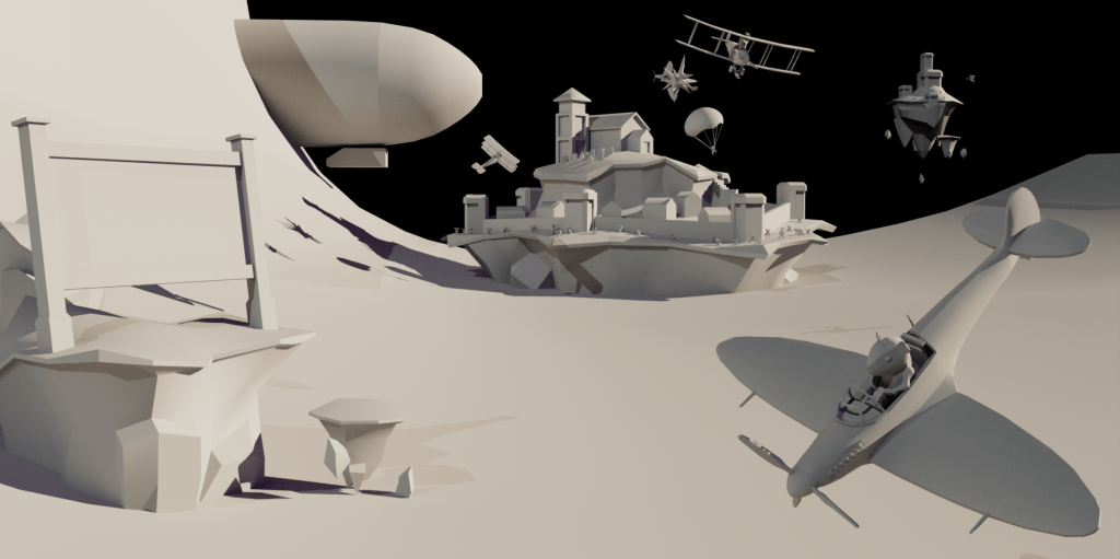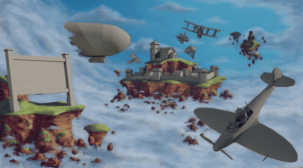 While working at PlayBoss I helped to come up with and create a pitch for an original game. This was for an arcade style flight sim racing and dog fighting game that would be similar to kart racing games but with aerial vehicles. The planes and weapons featured in the game were planned to be based on real planes used throughout history but adjusted to match the arcade style gameplay. The pilots of these planes would all be cartoon animals and the environments were to be set on floating islands in the clouds.