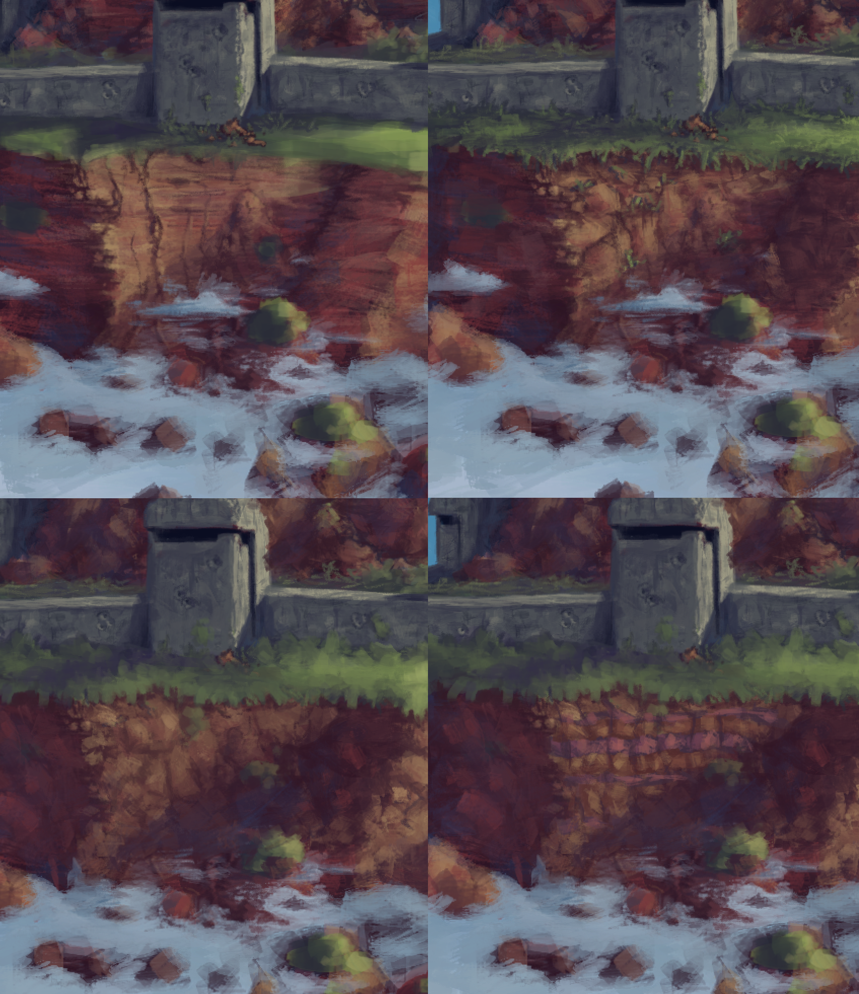 Below you can see how I experimented with different ways of painting the rock texture on the cliffs. I think it’s useful to work this way, to try out different ideas to make sure you’re picking the best one and it’s a good opportunity to get some input from the rest of the team.
