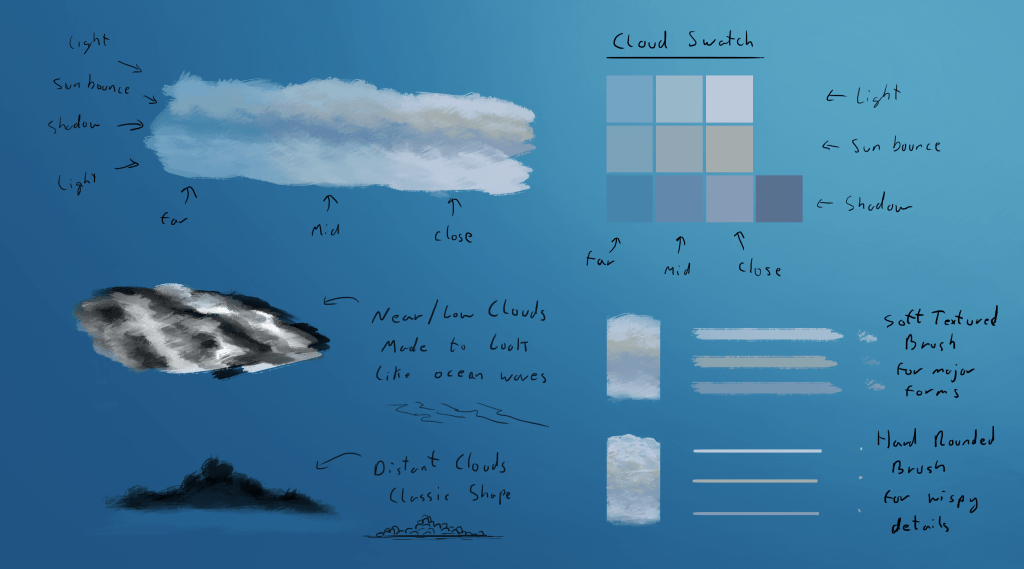 I first tackled painting in the sky and clouds, but before working on the actual piece I did some quick studies and came up with a process for painting the clouds. My goal with the clouds was to make them look like waves, as if the clouds formed this worlds equivalent of an ocean.