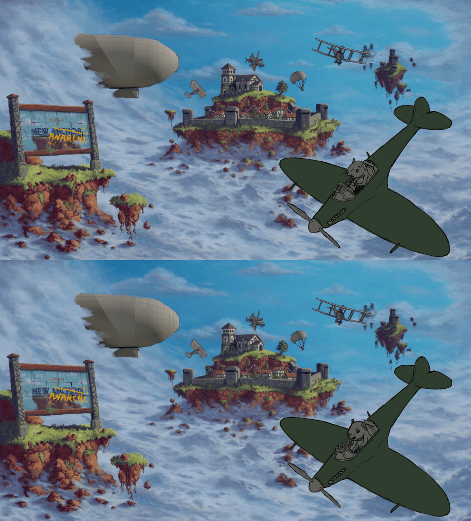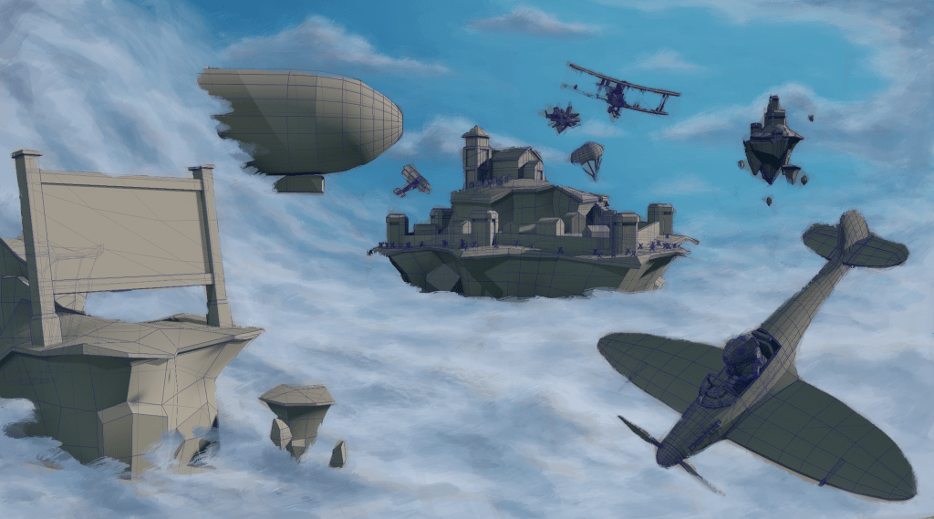 A lot of the inspiration for the visual style came from the Ghibli movie Porco Rosso, as well as various works from videogames, films, and other artists. The aim with the overall art style was to create something that had detailed painterly environments with cartoon cel shaded foreground elements and detailed effects for things like fire and smoke. For the colour pallet I wanted something vibrant and saturated without making it look too unrealistic. Part of the aim of this game was to base a lot of the features off of real things, real planes, real locations, real weapons, and real pilot’s uniforms. As a team we decided that we wanted it to be fun and fantastical but for it to also remain somewhat grounded in reality.