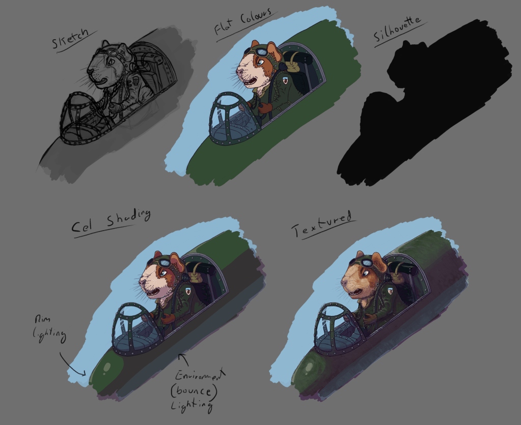 Here you can see the final design of the pilot Guinea pig that we used for the pitch and in the larger concept art piece. Once the design had been settled I then tried a few different ways of colouring and rendering the pig and his plane. The cel shaded look is the one we chose to use.