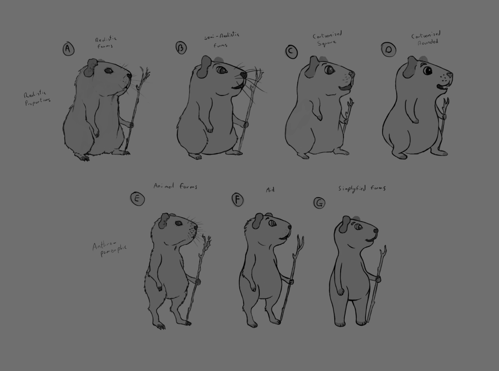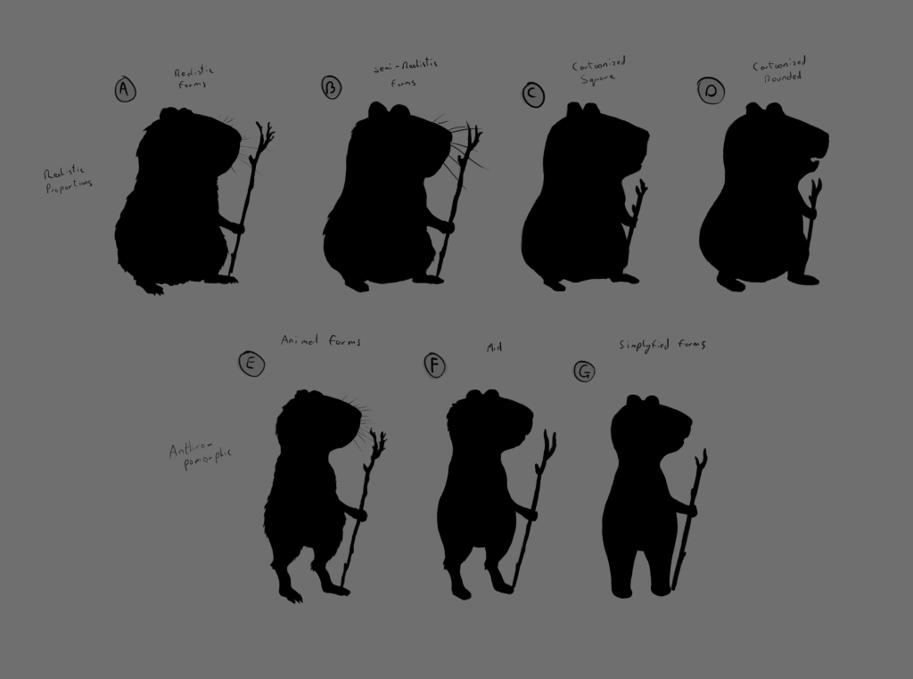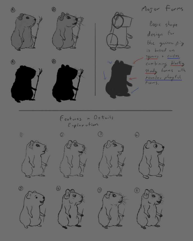 Next I tried creating a few different variations of a cartoon Guinea pig using important details from the previous studies. I tried several different styles for the anatomy from fairly realistic to very simplified. With all of these designs I also created silhouette versions to make sure the overall shape of the character was readable and recognisable.