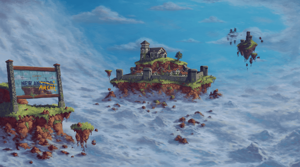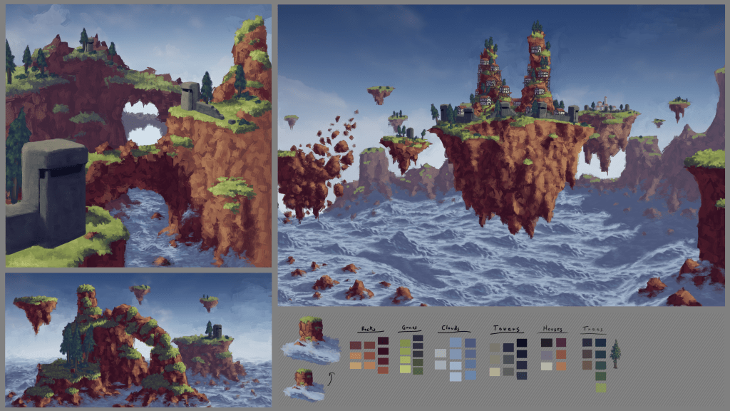 With the buildings and architecture I went for the classic idyllic village look. I felt this fit with the backstory of the game’s setting, being that it was a peaceful picturesque place up until the moment pirates and bandits started raiding the area. This would be reflected in the environment with evidence of destruction throughout the area (which isn’t shown in the concept art) as well as newer built defensive structures. For these I taken heavy inspiration from real defensive structures and bunkers used throughout the first and second world wars but with a fantasy twist that made them resemble old castle walls and turrets. These defensive structures would be a stark contrast to the older residential and civic buildings nestled behind them, showing how the recent history has affected the area and the animals that live on these floating islands.