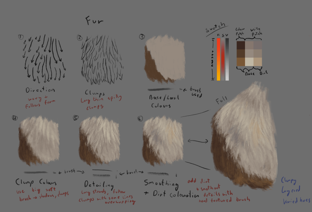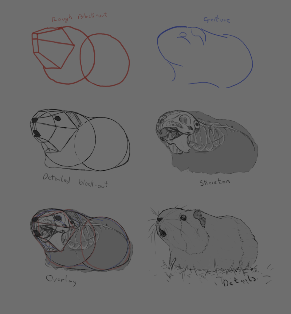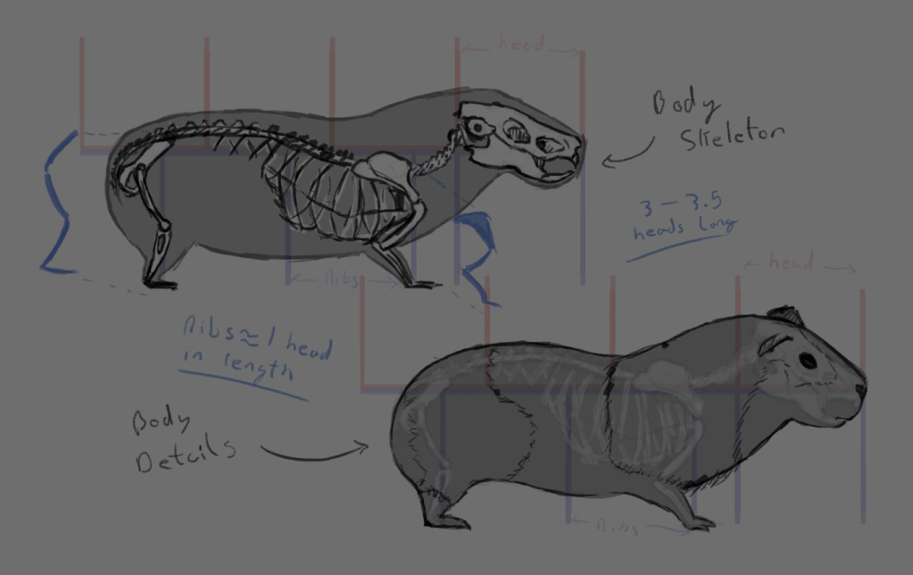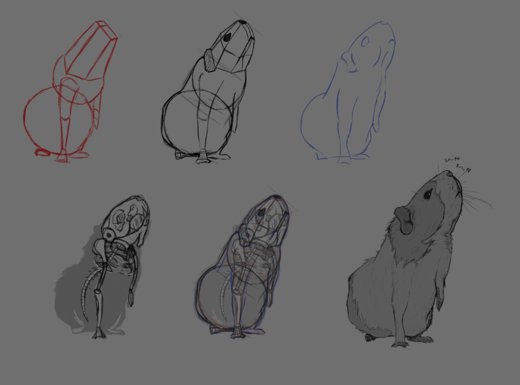 I used these studies to learn the anatomy of Guinea pigs and what details were important for making them recognisable. I also used this to start to figure out how to simplify or cartoonise a Guinea pig as well as develop a process for painting the fur.