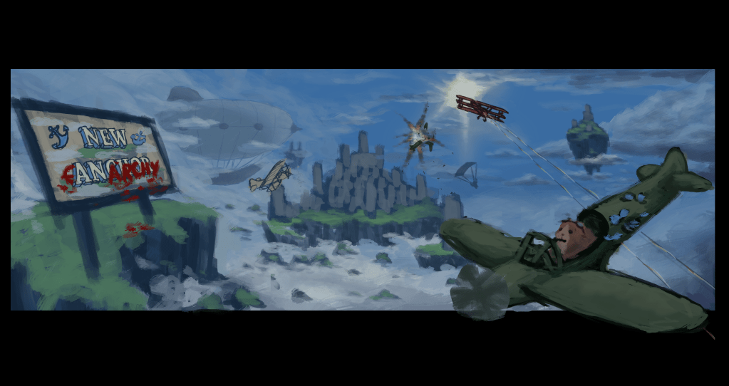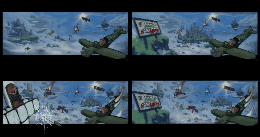 The final step was to incorporate the planes, pilots, explosions, etc. At this point I’d already done the groundwork of designing a character and narrowing down the style of foreground elements. So this step just involved doing the work to get everything drawn in. I did try a few different facial expressions for the main pilot to see what worked best, which I got feedback on from the rest of the team.